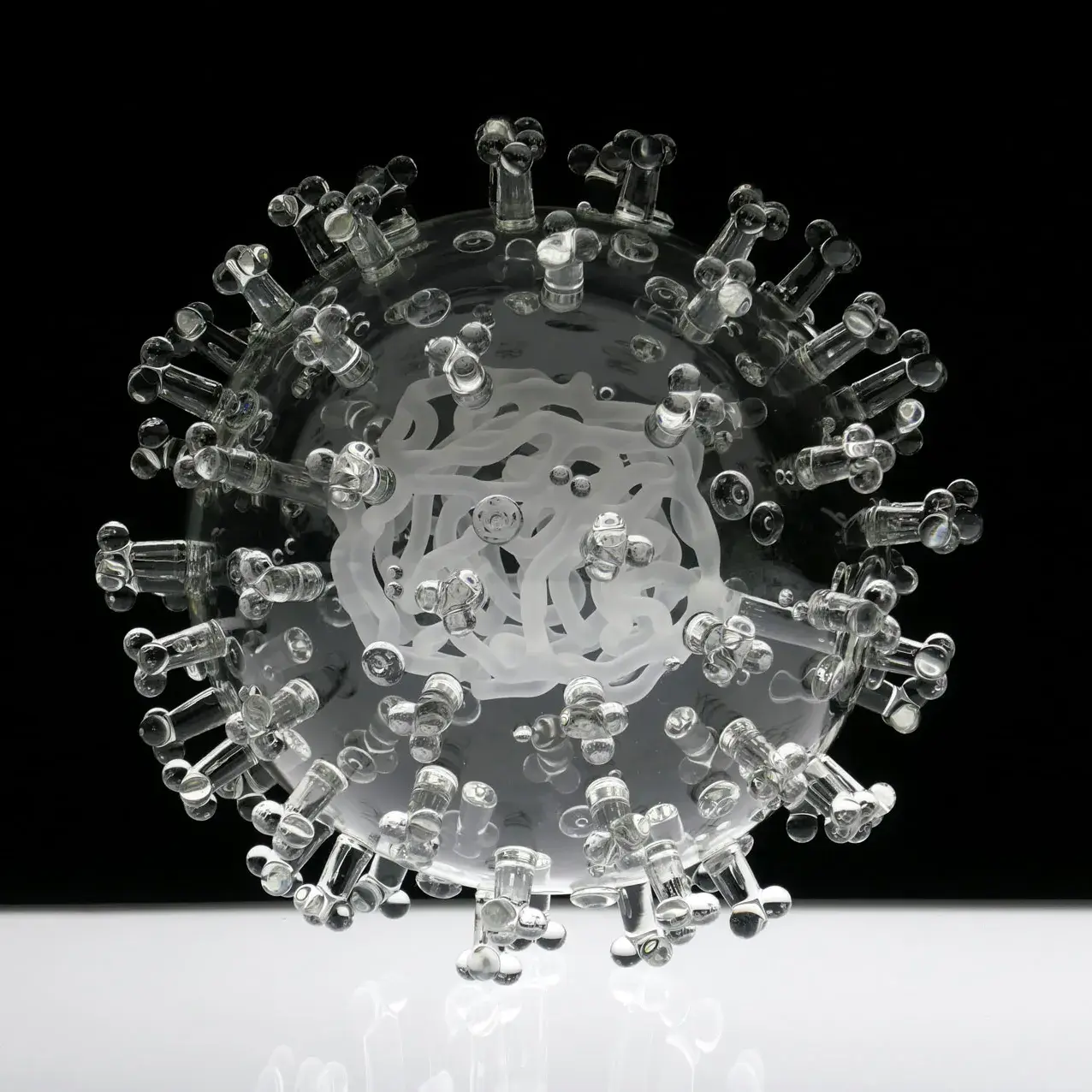 Британский художник Люк Джеррам тоже работает с вирусами, но в классическом художественном подходе: он создает скульптуры. С 2004 года он создаёт серию Glass Microbiology (на обложке этой газеты) — скульптуры из выдувного стекла, воспроизводящие вирусы в масштабе примерно миллион к одному: ВИЧ, вирус Зика, папиллома, E.coli, SARS-CoV-2. Скульптуры прозрачны, хрупки, изящны, они похожи на люстры или елочные игрушки.